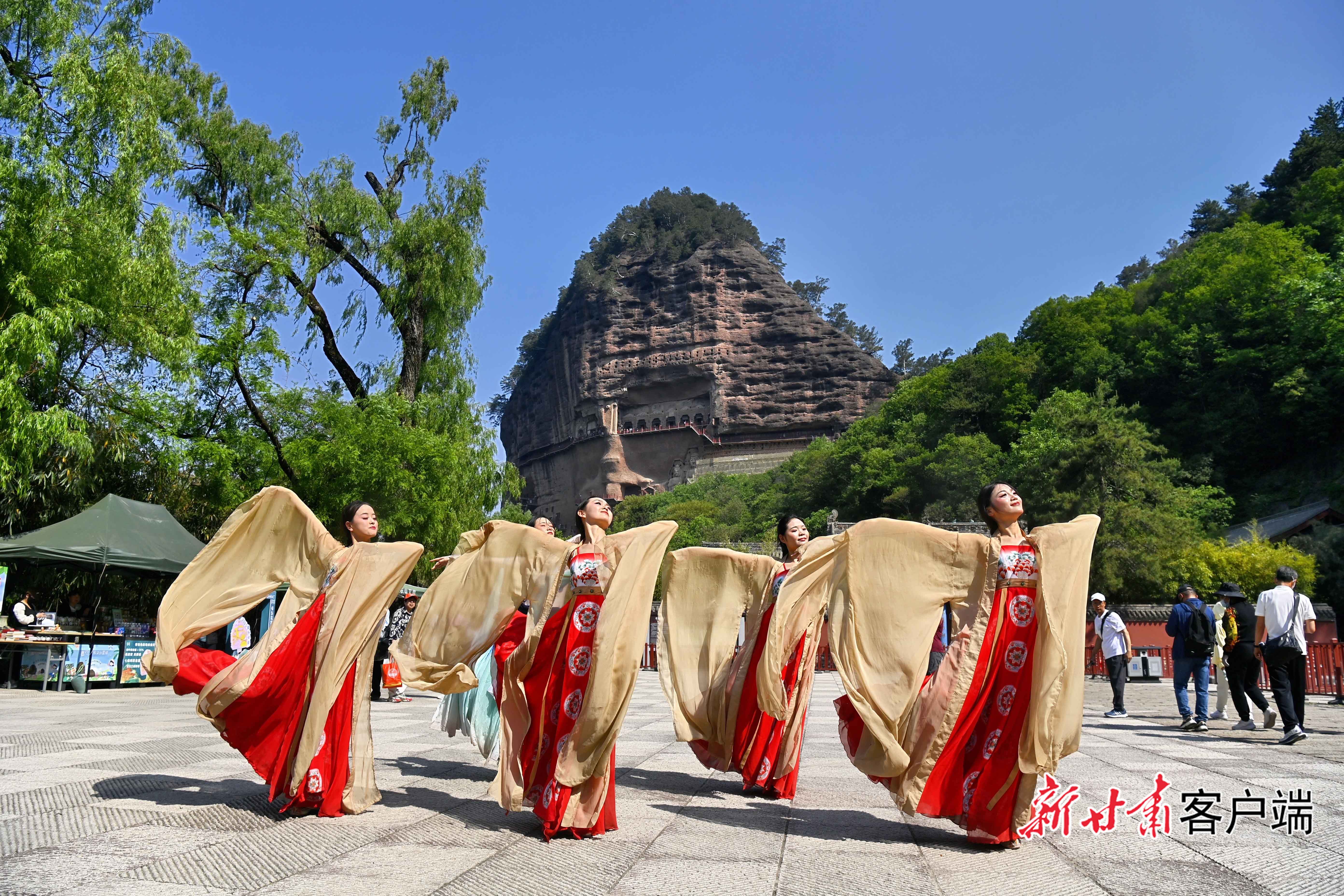 小满时节,天水市麦积山石窟窟区,鸟语花香,绿树成荫。天南海北的游客们登临栈道有序观赏,感受着千年石窟的无限魅力。
